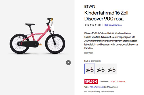 DECATHLON.de bietet aktuell im Laufe der SALE - Aktion ausgewählte Artikel billiger an, solange der Vorrat reicht.Das BTWIN Kinderfahrrad 16 Zoll Discover 900 in verschiedenen Farben bekommt man im Laufe dieser Aktion für 189,99€ zzgl. 8,99€ Versand, Filialabholung ist versandkostenfrei. Dieses 16-Zoll-Fahrrad ist für Kinder mit einer Größe von 103–125 cm (4–6 Jahre) geeignet. Mit Aluminiumrahmen und innovativem Bremssystem ist es leicht und bequem Anzahl der Schaltgänge: 1 Gang DECATHLON Kunden haben dieses leichte Kinderfahrrad mit 4,8 Sternen benotet (295 Bewertungen).
