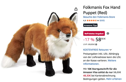 Amazon bietet aktuell die Folkmanis Fox Hand Puppet - Rotfuchs Handpuppe für 58,30€ an, solange der Vorrat reicht. Ideale Unterstützung für Spiel und Phantasie Spielbar: Maul und Pfoten Länge: 51 cm, Höhe: 28 cm Amazon Kunden haben diese Handpuppe zum Rollenspielen und Geschichtenerzählen mit 4,4 Sternen benotet (693 Bewertungen).