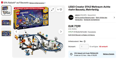 Dank dem Gutscheincode: PRESALE25 (zur Kasse gehen und dort einlösen) bekommt man bei eBay bis zum 12.11.2025 einen 10% Rabatt (2x einlösbar und max. 50€) auf ausgewählte Technik & Co., solange der Vorrat reicht. Den LEGO Creator 31142 Weltraum-Achterbahn Bausatz NEU&OVP bekommt man im Laufe dieser Aktion für 70,19€ inkl. Versand. 3 coole LEGO Kirmes-Fahrgeschäfte zum Bauen und Umbauen in einer Box Die Weltraum-Achterbahn ist 27 cm hoch, 27 cm breit und 55 cm tief enthält einen LEGO Lichtstein Enthält 874 Teile Dieser kreative Bausatz wurde von Amazon Kunden mit 4,7 Sternen benotet (1415 Bewertungen).