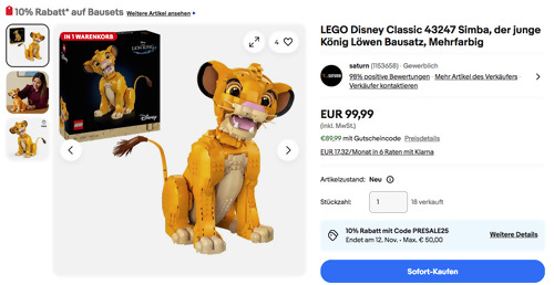 Dank dem Gutscheincode: PRESALE25 (zur Kasse gehen und dort einlösen) bekommt man bei eBay bis zum 12.11.2025 einen 10% Rabatt (2x einlösbar und max. 50€) auf ausgewählte Technik & Co., solange der Vorrat reicht. Den LEGO Disney Classic 43247 Simba, der junge König Löwen Bausatz NEU&OVP bekommt man im Laufe dieser Aktion für 89,99€ inkl. Versand. Das hochwertige LEGO Spielset für Erwachsene ist eine tolle Geschenkidee für erwachsene Fans von Der König der Löwen und ein imposantes Ausstellungsstück. Diese LEGO Disney Tierfigur stellt Simba mit beweglichem Kopf dar. Enthält 1.445 Teile. Dieser detailgenaue Lego-Bausatz wurde von Amazon Kunden mit 4,8 Sternen benotet (789 Bewertungen).