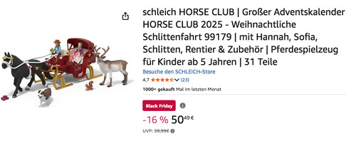 Amazon bietet aktuell im Laufe der Black Friday Woche - Aktion ausgewählte Artikel billiger an, solange der Vorrat reicht. Den Schleich HORSE CLUB 99179 Großen Adventskalender 2025 bekommt man im Laufe dieser Aktion für 50,49€. Hinter jedem Türchen wartet eine neue Überraschung: Pferd, Rentier, Hund, Schlitten, 2 bewegliche Figuren und weiteres Zubehör – ideal für kleine Entdecker ab 5 Jahren. Der weihnachtlich dekorierte Schlitten ist nur im schleich Weihnachtskalender enthalten. 31 Teile Amazon Kunden haben diesen wunderschönen Adventskalender mit 4,7 Sternen benotet (23 Bewertungen).