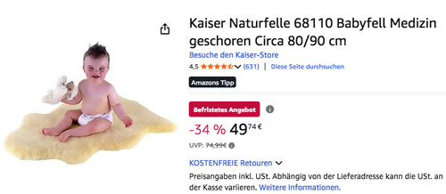 Amazon bietet aktuell das Kaiser Naturfelle 68110 Babyfell für 49,74€ an, solange der Vorrat reicht. 100% echtes Lammfell Temperaturausgleichend: Kühlt im Sommer, wärmt im Winter schadstoffarme und chromfreie Gerbung Antibakterielle Wirkung Handwäsche bei 30 °C mit speziellem Lammfellwaschmittel
