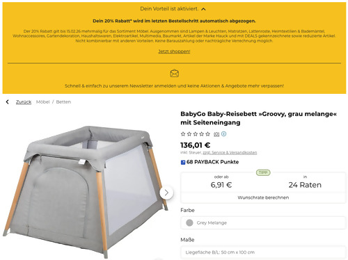 Baur.de bietet bis 15.02.26 einen 20% Rabatt auf ausgewählte Möbel an, solange der Vorrat reicht.20% Rabatt wird nach Aktivierung im Bestellschritt 5 automatisch abgezogen. Das BabyGo Baby-Reisebett »Groovy Grau Melange« mit Seiteneingang bekommt man im Laufe dieser Aktion für 108,81€ zzgl. 5,95€ Versand. Stabiles Gestell mit Holzbeinen; Netzgewebe, damit das Kind durchsehen kann B/T/H: ca. 55/103/74-88 cm Weiche Rundum-Polsterung Inklusive Tragetasche und Matratze Werkzeug wird für den Aufbau nicht benötigt