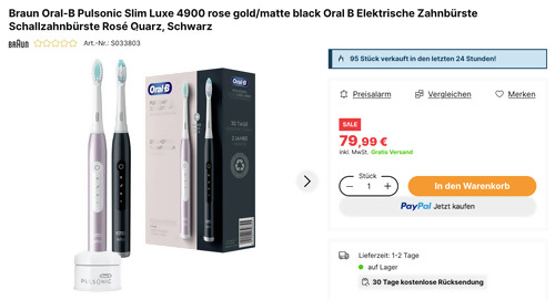 Voelkner.de bietet aktuell das Braun Oral-B Pulsonic Slim Luxe 4900 Elektrische Zahnbürste 2er Set für 79,99€ inkl. Versand an, solange der Vorrat reicht. Doppelpack: enthält 2 Schallzahnbürsten, ideal für Paare, Familien und Reisende Farbe: Rosé Quarz + Schwarz Sanfte Vibrationen entfernen Plaque besser als eine herkömmliche Handzahnbürste 3 Reinigungsmodi: Tägliche Reinigung, Aufhellen und Sensitiv 2 Wochen Akkulaufzeit mit einer Aufladung Im Lieferumfang enthalten: 2 elektrische Schallzahnbürsten, 2 Aufsteckbürsten, 1 Ladestation