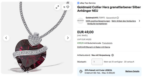 Dank dem Gutscheincode: LIEBE26 (zur Kasse gehen und dort einlösen) bekommt man bei eBay bis 8.2.2026,, 23:59 Uhr einen 20% Rabatt (2x einlösbar max. 200€) auf ausgewählte Luxusuhren, Designer-Handtaschen, Echtschmuck & Sneaker, solange der Vorrat reicht.Das Goldmaid Collier Herz granatfarbener Silber Anhänger NEU&OVP bekommt man im Laufe dieser Aktion für 39,20€ inkl. Versand an, solange der Vorrat reicht. Anhänger: Höhe: 20 mm Breite: 14 mm Tiefe: 11 mm 10 Zirkonia weiss Vollschliff Zirkonia rot-braun Millenium Panzerkette 45 cm mit Federring Legierung: 925/- Sterling Silber,anlaufgeschützt,rhodiniert Materialgewicht: ca. 9,0 gr. inkl. Goldmaid Etui und Schmuckzertifikat Diese Herzkette wurde von Amazon Kunden mit 4,3 Sternen benotet (216 Bewertungen).