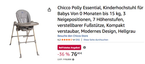Amazon bietet aktuell den Chicco Polly Essential Kinderhochstuhl in Hellgrau für 76,40€ an, solange der Vorrat reicht. Der Chicco Polly Essential Hochstuhl lässt sich in 7 Höhenstufen verstellen, wodurch er für jeden Tisch und jede Verwendung geeignet ist. Die Rückenlehne kann in 3 Positionen verstellt werden Von der Geburt bis zu 3 Jahren, max. 15 kg Lässt sich ultrakompakt überall verstauen