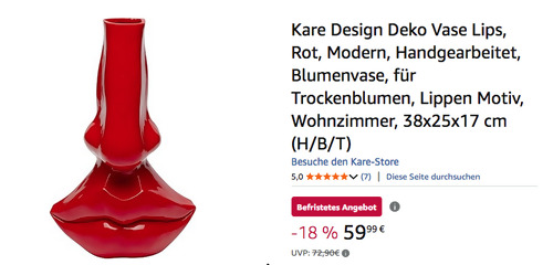 Amazon bietet aktuell die Kare Design 56650 Deko Vase "Nose Lips" in Rot für 59,99€ an, solange der Vorrat reicht. Extravagante Deko-Vase in Rot mit stilisierter Lippen- und Nasenform Geeignet für kreative Arrangements mit Trockenblumen oder anderen Dekoelementen Aus formstabilem Polyresin gefertigt und in detailverliebter Handarbeit vollendet Produktabmessungen: 17L x 24,5B x 37,5H cm