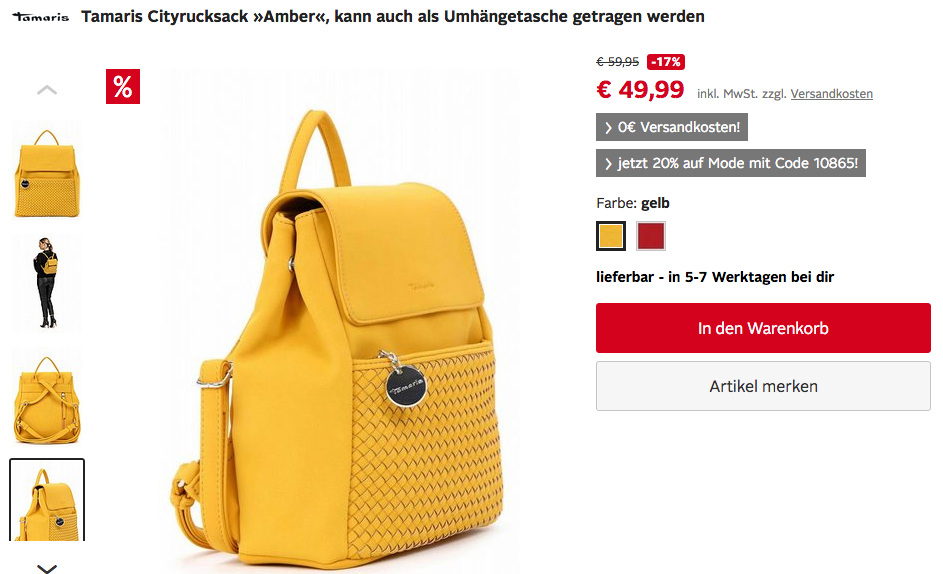 Den Tamaris Cityrucksack "Amber" in Gelb oder Rot bekommt man im Laufe dieser Aktion für 39,99€.