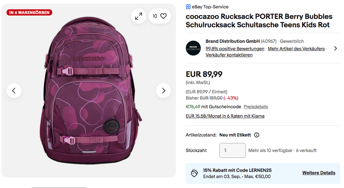 Dank dem Gutscheincode: LERNEN25 (zur Kasse gehen und dort einlösen) bekommt man bei eBay bis zum 03.09.2024 einen 15% Rabatt (gilt ab 15€, 2x einlösbar und max. 50€) auf ausgewählte Artikel zum Schulstart, solange der Vorrat reicht.