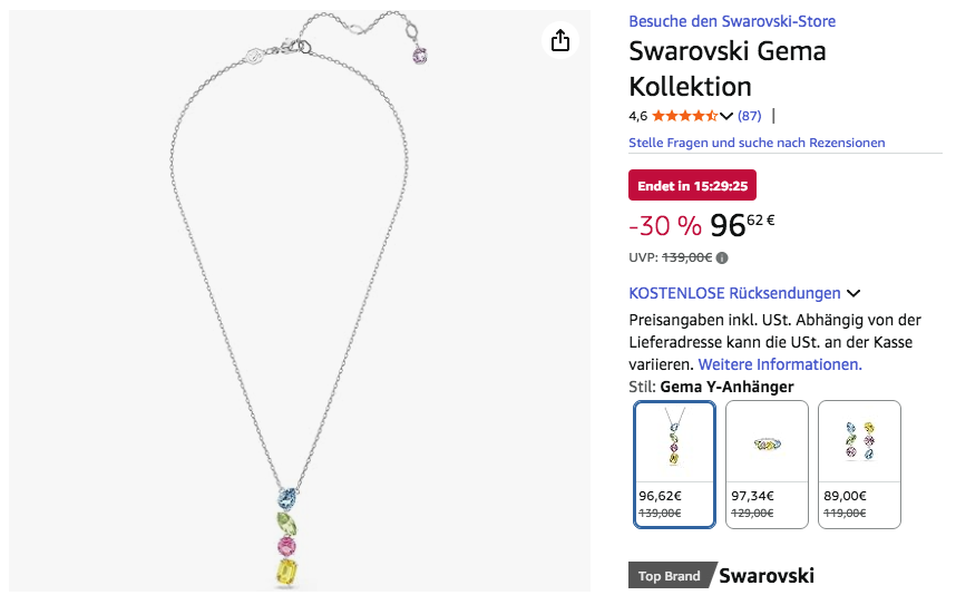Amazon bietet aktuell den Swarovski 5692421 Gema Y-Anhänger für 96,62€ an, solange der Vorrat reicht.