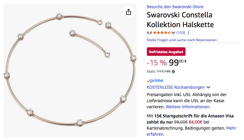 Amazon bietet aktuell die Swarowski 5609710 Constella Halskette für 99€ an, solange der Vorrat reicht.