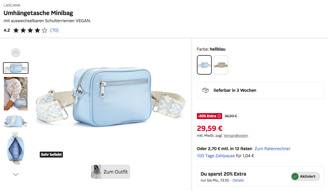 Die LASCANA Umhängetasche Minibag bekommt man im Laufe dieser Aktion für 29,59€ zzgl. 4,95€ Versand.