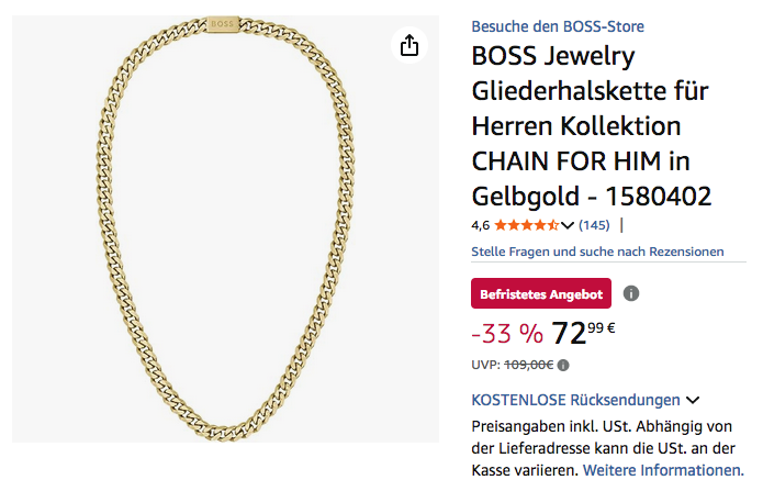 Amazon bietet aktuell die BOSS Jewelry 1580402 Gliederhalskette in Gelbgold für 72,99€ an, solange der Vorrat reicht.