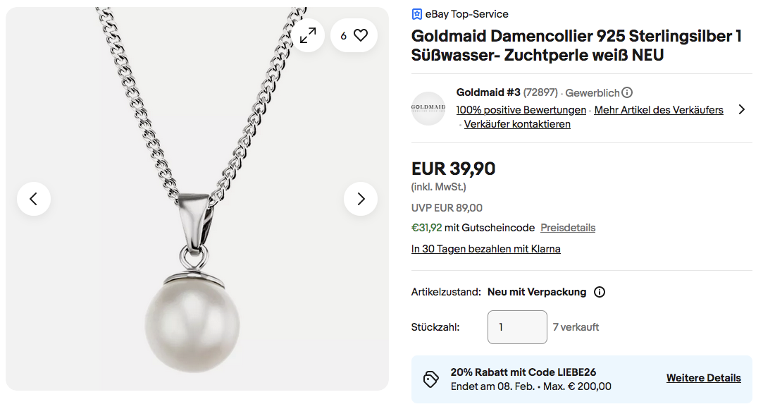 Dank dem Gutscheincode: LIEBE26 (zur Kasse gehen und dort einlösen) bekommt man bei eBay bis 8.2.2026,, 23:59 Uhr einen 20% Rabatt (2x einlösbar max. 200€) auf ausgewählte Luxusuhren, Designer-Handtaschen, Echtschmuck & Sneaker, solange der Vorrat reicht.