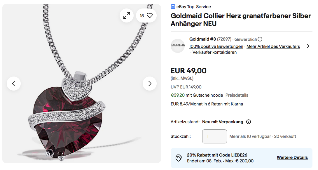 Dank dem Gutscheincode: LIEBE26 (zur Kasse gehen und dort einlösen) bekommt man bei eBay bis 8.2.2026,, 23:59 Uhr einen 20% Rabatt (2x einlösbar max. 200€) auf ausgewählte Luxusuhren, Designer-Handtaschen, Echtschmuck & Sneaker, solange der Vorrat reicht.