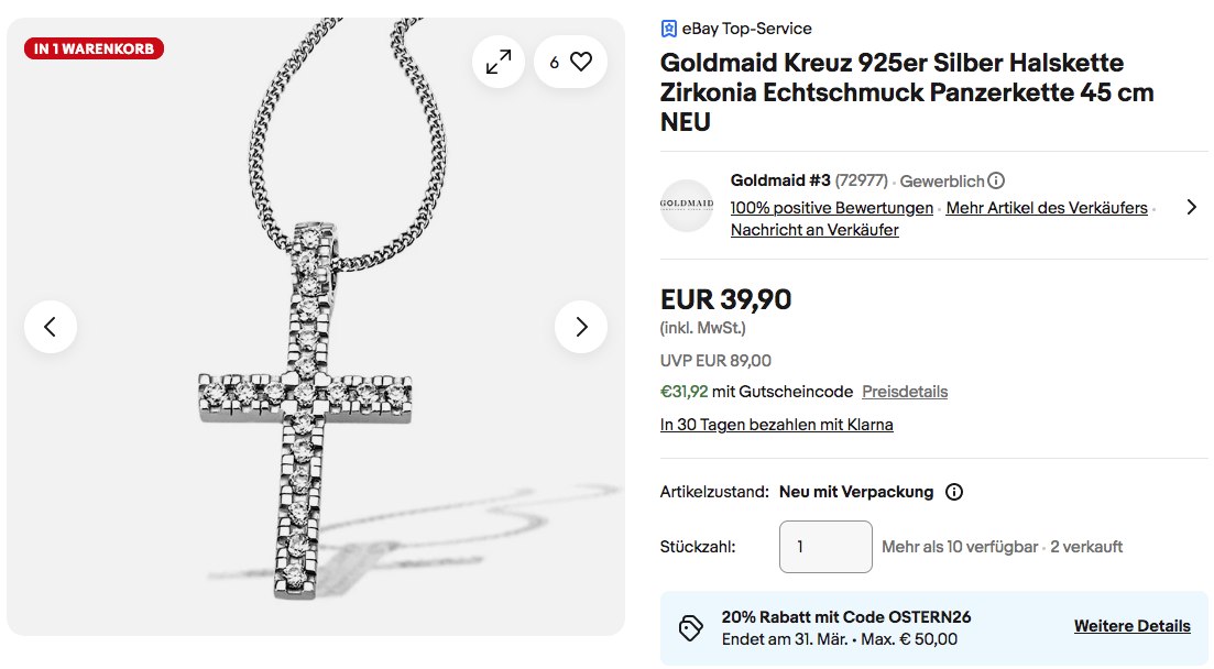 Die Goldmaid Kreuz 925er Silber Halskette 45 cm NEU&OVP bekommt man im Laufe dieser Aktion für 31,92€ inkl. Versand.