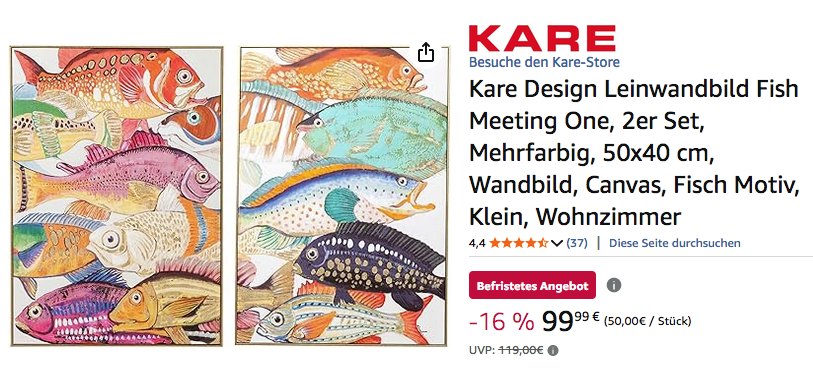 Amazon bietet aktuell das Kare Design 50x40 cm Leinwandbild Fish Meeting One 2er Set für 99,99€ an, solange der Vorrat reicht.
