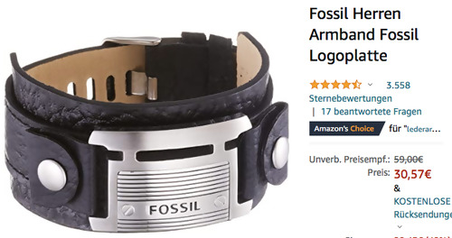 Amazon bietet aktuell ausgewählte Uhren und Schmuck von Fossil, Michael Kors und Diesel billiger an, solange der Vorrat reicht. Das Fossil Herren Leder-Armband mit Logoplatte bekommt man im Laufe dieser Aktion für 30,57€. Schwarze Ledermanschette mit Edelstahlelementen Länge 25 cm Dornschliesse Amazon Kunden haben dieses schicke Armband mit sehr guten 4,6 Sternen benotet (3558 Sternebewertungen).