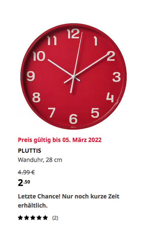 IKEA PLUTTIS Wanduhr, rot, 28 cmAngebot gilt bis 5. März 2022 bei IKEA Erfurt, gilt nicht für einen Kauf über Click & Collect und solange der Vorrat reicht.