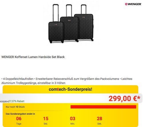 Comtech.de bietet im Laufe der Comweek-Aktion (bis zum 04.09.18) unter anderem das WENGER Kofferset Lumen Hardside in Schwarz für 299€ inkl. Versand an, solange der Vorrat reicht. 4-Doppelleichtlaufrollen Erweiterbarer Reissverschluß zum Vergrößern des Packvolumens Zwei Reisverschlussfächer im Innenteil Fixierungsgurt im Innenbereich Leichtes Aluminium Trolleygestänge, einstellbar in 3 Höhen TSA-Zahlenkombinationsschloss an der Kofferaußenseite S = 39 x 55 x 22 cm (B x H x T) 2,6 Kg M = 48 x 67 x 27 cm (B x H x T) 3,6 Kg L = 54 x 77 x 32 cm (B x H x T) 4,5 Kg