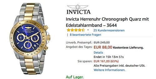 Bei Amazon werden heute, 09.04.18, ausgewählte Invicta Uhren billiger angeboten. Die Invicta Herrenuhr Chronograph Quarz mit Edelstahlarmband – 3644 kostet heute bei Amazon nur noch 88€. Blaue Anzeige auf dem Zifferblatt des Chronographen auf goldenem Edelstahl mit vergoldetem Armband Wasserdicht bis 200 m Schützendes Mineral-Zifferblattfenster Schweizer Uhrwerk aus Quarz von Invicta Gehäusedurchmesser: 40 Millimeter Höhe des Gehäuses: 13 Millimeter Breite des Armbands: 20 Millimeter Diese Invicta Herrenuhr wurde von Amazon Kunden mit sehr guten 4,4 Sternen benotet (25 Kundenrezensionen).