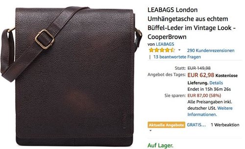 Bei Amazon werden heute, 20.05.18, ausgewählte Ledertaschen und Kulturbeutel von LEABAGS billiger angeboten. Die LEABAGS London Umhängetasche aus echtem Büffel-Leder im Vintage Look in verschieden Farben kostet heute bei Amazon 62,98€, solange der Vorrat reicht. Material: Edles Büffelleder, das durch die geölte Oberfläche seinen einzigartigen, besonderen Vintage Look erhält 100% Handarbeit Maße (L x B x H): ca. 26x31x8cm (ideal für A4 Dokumente, Netbook) Hochwertig verarbeitetes Innenfutter aus Poly-Cotton in edlem olivgrün Amazon Kunden haben diese Umhängetasche mit sehr guten 4,4 Sternen bewertet (290 Kundenrezensionen).