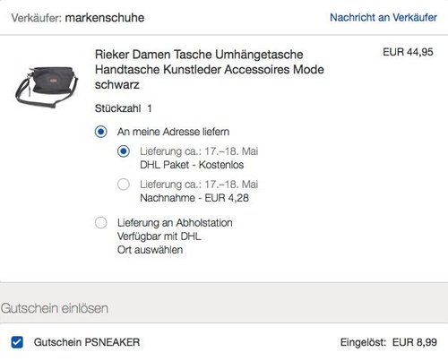 Bei eBay bekommt man bis zum 23.5.2018 mit Code: PSNEAKER (zur Kasse gehen und dort einlösen) zusätzlich 20% Rabatt (max. 50€) auf ausgewählte Sneaker, Mode, Accessoires und mehr für sie und ihn. Beispiel Warenkorb - Rieker Damen Tasche Umhängetasche: aus Lederimitat zwei Hauptfächer und ein Rückfach mit Reißverschluss Futter aus Textil Innenfächer Riemen zum Abnehmen und Verstellen Maße ca. 20 x 26 x 10 cm