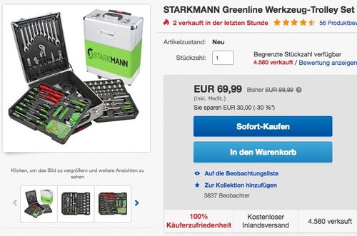 Bei Ebay kriegt man das STARKMANN Greenline Werkzeug-Trolley Set 399 tlg. für 69,99€ inkl. Versand. Der abschließbare Aluminium Werkzeugkoffer von STARKMANN mit 399 verschiedenen Werkzeugteilen auf 4 Ebenen ist ein universelles Sortiment für Reparaturen in Haus, Garten oder Hobbywerkstatt. Neu und OVP Werkzeuge sind aus hochwertigem Chrom-Vanadium-Stahl 3,7 Sternebewertung bei Amazon (126 Kundenrezensionen) Mehr Produktdetails bitte aus der Shopseite entnehmen.