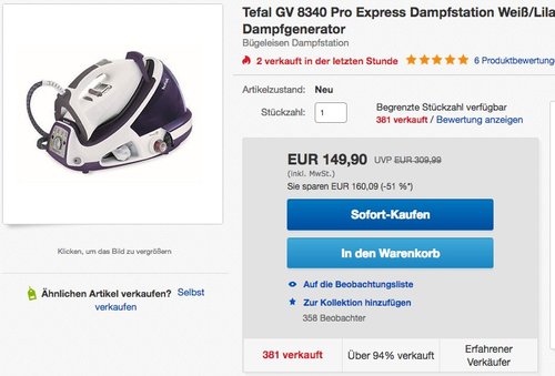 Bei Ebay bekommt man aktuell die Tefal GV 8340 Pro Express Dampfstation für 149,90€. Für jeden, der viel bügeln muss, kann sich eine Anschaffung von Dampfbügelstation lohnen. Mit genügend Wasserdampf und Druck wird der Arbeitsaufwand reduziert und die Kleidung wird schon nach wenigen Bügelbewegungen schön glatt. Tefal GV 8340 Pro Express Dampfstation:Neu und OVPDurilium Bügelsohle mit ACTIF-Linien"Rückwärtsgang" für beste Gleiteigenschaften (Ultragliss Turbo)Eco FunktionVertikaldampf2200 Watt LeistungBetriebsbereit in 2 MinutenKapazität des Wassertanks: 1,8lAbnehmbar und jederzeit befüllbarAbschaltautomatik nach 8 Minuten ohne Gebrauch6,5 bar Druckdampf bei einer Dampfmenge von 0-120 g/min
