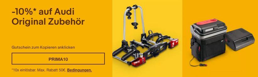 Dank dem Gutscheincode: PRIMA10 (zur Kasse gehen und dort einlösen) bekommt man bei eBay aktuell einen 10% Rabatt (max. 50€) auf ausgewähltes Audi Original Zubehör.