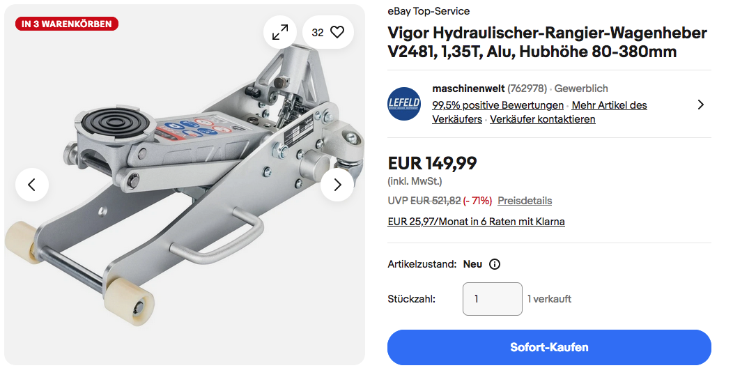 Maschinenwelt bietet aktuell den Vigor Hydraulischer-Rangier-Wagenheber V2481 NEU&OVP für 149,99€ inkl. Versand an, solange der Vorrat reicht.