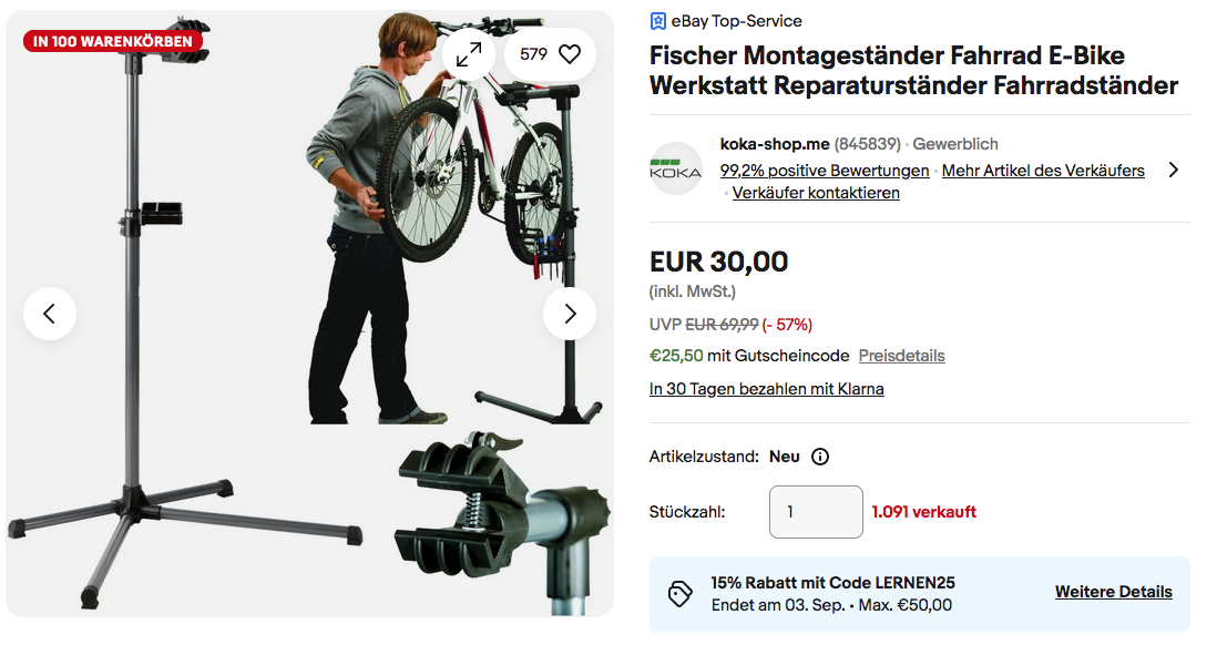 Dank dem Gutscheincode: LERNEN25 (15% Rabatt auf ausgewählte Artikel) bekommt man diesen praktischen Fahrradständer für 25,50€.