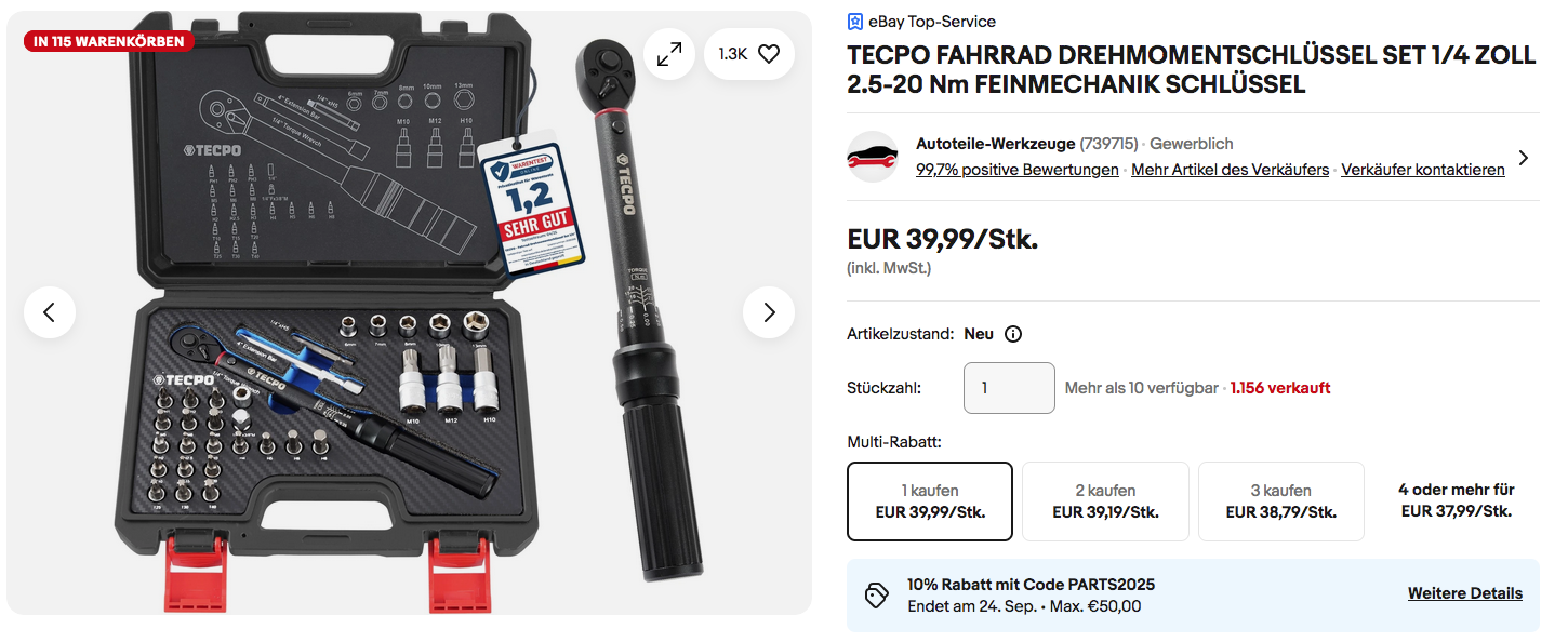 Den TECPO 32-tlg. Fahrrad Drehmomentschlüssel Set 1/4" 2,5-20 Nm NEU&OVP bekommt man im Laufe dieser Aktion für 35,99€ inkl. Versand, solange der Vorrat reicht.