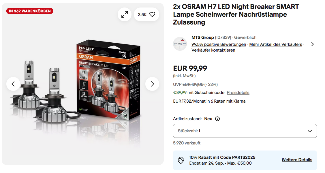 Dank dem Gutscheincode: PARTS2025 (zur Kasse gehen und dort einlösen) bekommt man bei eBay bis zum 24.09.2025 einen 10% Rabatt (2x einlösbar und max. 50€) auf ausgewählte Fahrzeugteile & Zubehör, solange der Vorrat reicht.