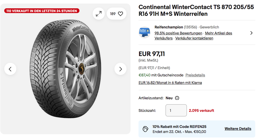 Dank dem Gutscheincode: REIFEN25 (zur Kasse gehen und dort einlösen) bekommt man bei eBay bis zum 22.10.2025 einen 10% Rabatt (2x einlösbar und max. 50€) auf ausgewählte Reifen, Felgen, Kompletträdern & Reifenmontage, solange der Vorrat reicht.