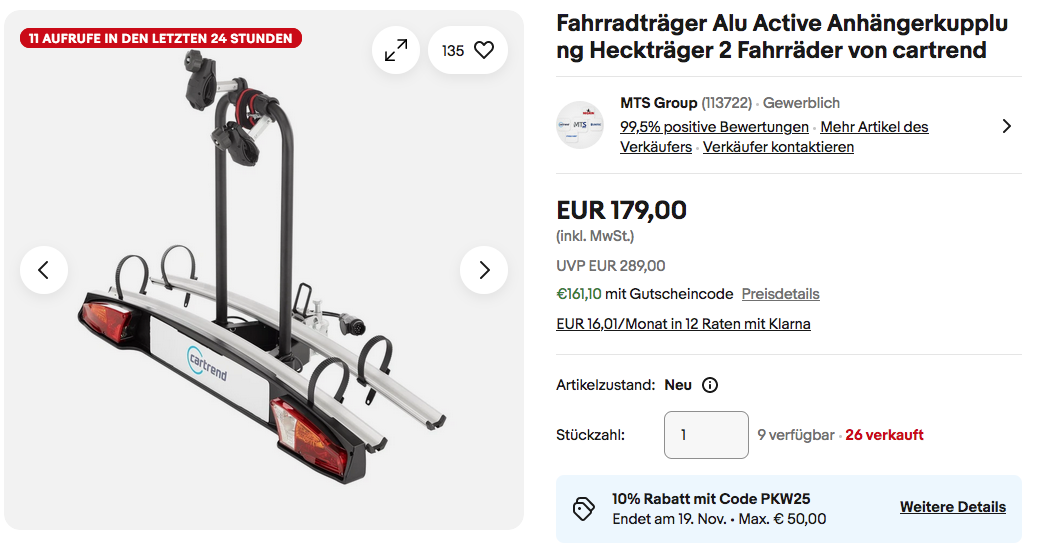 Den CARTREND 11116 Fahrradträger Alu Active für 2 Fahrräder NEU&OVP bekommt man im Laufe dieser Aktion für 161,10€ inkl. Versand an, solange der Vorrat reicht.