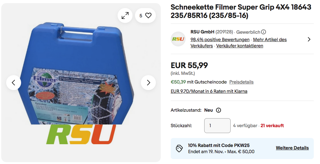 Die Filmer Super Grip 4X4 18643 235/85R16 2x Schneeketten NEU&OVP bekommt man im Laufe dieser Aktion für 50,39€ inkl. Versand an, solange der Vorrat reicht.