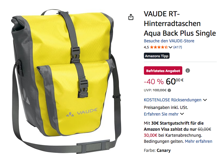 Amazon bietet aktuell die VAUDE RT-Hinterradtaschen Aqua Back Plus Single in Canary für 60€ an, solange der Vorrat reicht.