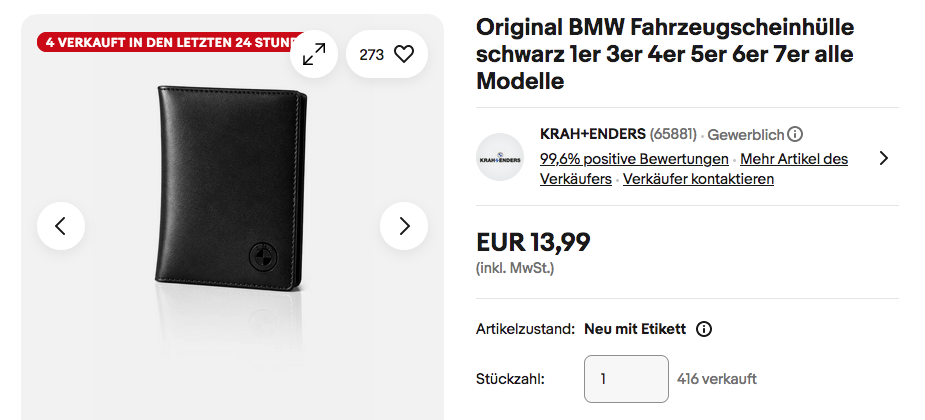 KRAH+ENDERS bietet aktuell bei eBay die Original BMW Fahrzeugscheinhülle in Schwarz NEU&OVP für 13,99€ inkl. Versand an, solange der Vorrat reicht.