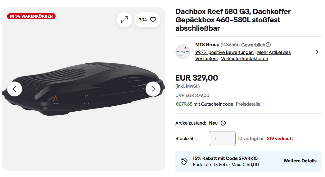 Dank dem Gutscheincode: SPARK15 (15% Rabatt auf ausgewählte Artikel) bekommt man bis 16.02.26 bei eBay die Cartrend 22216 Dachbox Reef 580 G3 NEU&OVP für 279,65€ inkl. Versand, solange der Vorrat reicht.
