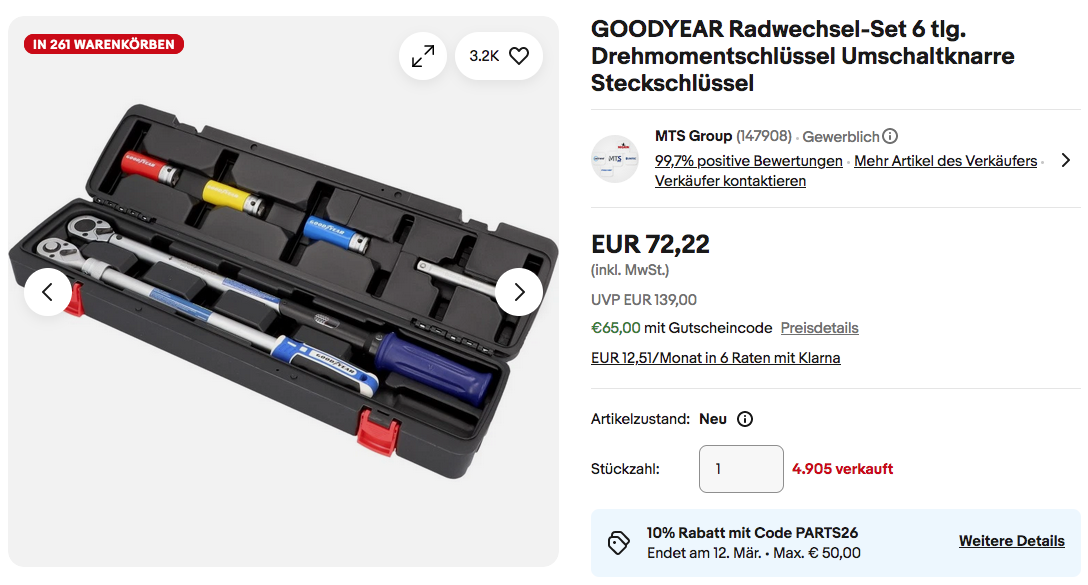 MTS Group bietet aktuell bei eBay das GOODYEAR 11086 6-tlg. Drehmomentschlüssel Radwechsel-Set NEU&OVP für 72,22€ inkl. Versand an, solange der Vorrat reicht.