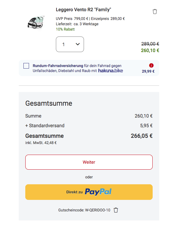 Den Leggero Vento R2 "Family" Fahrradanhänger bekommt man im Laufe dieser Aktion für 260,10€ zzgl. 5,95€ Versand.