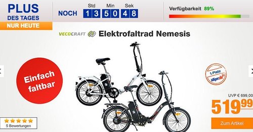 Plus.de Onlineshop bietet heute, 20.06.18, als Plus des Tages das Vecocraft Nemesis Elektrofaltrad E-Bike 20" in Weiß oder Schwarz für 519,99€ inkl. Versand an, solange der Vorrat reicht. Ein 20 Zoll Elektro-Klapprad ist ein idealer Begleiter in der Stadt oder im Urlaub (lässt sich leicht zu verstauen im Wohnmobil oder auf dem Boot). Vecocraft Nemesis Elektrofaltrad E-Bike 20": RAHMEN: 20" Stahl / faltbar MOTOR: 36V 250W XF / Hintermotor / schwarz DISPLAY: LED Display BATTERIE: 36V 8Ah Lithium Batterie REICHWEITE: 30-50km REIFEN: 20*1.75 Reifen BREMSE (VORNE): V Bremse BREMSE (HINTEN): V Bremse ZAHNKRANZ (HINTEN): 1 Gang