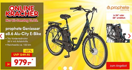 Netto Marken-Discount Onlineshop bietet bis zu Samstag 12.05.18 das Prophete E-Bike Alu-City Geniesser e8.6 Damen 26" oder 28" für 979€ inkl. Versand an, solange der Vorrat reicht. Motor: TRIO Vorderradmotor 36 Volt mit Anfahrhilfe Leistung: 250 Watt, max. 30 NM Steuereinheit: TRIO Steuerdisplay mit LED-Anzeige Akku: SAMSUNG Side-Click Lithium-Ionen 36 Volt, 10,4 Ah max. Reichweite: ca. 100 km (je nach Fahrweise) Schaltung: 7-Gang SHIMANO NEXUS Nabenschaltung mit Drehgriffschalter Farbe: dunkelgrün matt, Federgabel glanzschwarz Damen 26": Alu-Urban-Premium-Rahmen CUBUS, Rahmenhöhe 46 cm Damen 28": Alu-Urban-Premium-Rahmen CUBUS, Rahmenhöhe 48 cm
