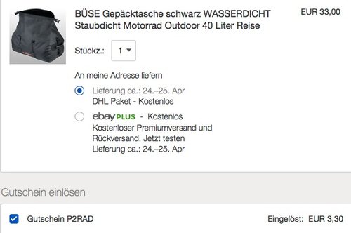 Bei eBay bekommt man bis zum 02.5.2018 mit Code: P2RAD (zur Kasse gehen und dort einlösen) zusätzlich 10% Rabatt (max. 50€) auf Motorradteile & -zubehör. Die BÜSE Motorrad Outdoor 40 Liter Gepäcktasche in Schwarz NEU&OVP kostet im Laufe dieser Aktion nur noch 29,70€ inkl. Versand, solange der Vorrat reicht. Robuste, reißfeste Gepäcktasche mit großem, querliegendem Rollverschluss. Obermaterial: 100% Polyester 100% wasser- und staubdicht Volumen: ca. 40 Liter Größe: Länge ca. 60 cm, Ø ca. 30 cm Bei Amazon wurde diese Gepäcktasche mit sehr guten 4,5 Sternen benotet (38 Kundenrezensionen).