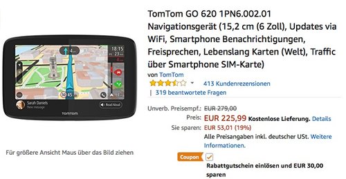 Dank dem 30€ Rabattgutschein (Coupon anklicken und der Rabatt wird automatisch beim Kauf an der Kasse abgezogen) bekommt man bis 02.05.18 das TomTom GO 620 Navigationsgerät 15,2 cm (6 Zoll) für 195,99€. Erhalten Sie die Karten und aktuellste Software für Ihr TomTom GO über das integrierte Wi-Fi Ihr TomTom GO kann Ihnen Textnachrichten von Ihrem Telefon vorlesen - Ihre Hände bleiben am Lenkrad und Ihr Blick auf der Straße TomTom GO wurde für erstklassiges Freisprechen im Auto entwickelt. Einfach mit dem Telefon verbinden; USB-Anschluss; Bluetooth Lebenslang Karten-Updates (Welt) Lebenslang Radarkameras (auf Wunsch) Lebenslang TomTom Traffic TomTom MyDrive TomTom-Dienste über eine Smartphone SIM-Karte Lieferumfang: GO 620, Aktiv-Magnethalterung, Autoladegerät, USB-Kabel und Produktinformation Bei Amazon wurde dieses 6-Zoll-Navigationsgerät mit 3,5 Sternen bewertet (413 Kundenrezensionen).