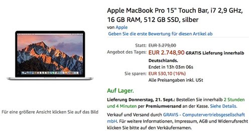 Tagesangebot!Apple MacBook Pro 15" Touch Bar:Touch Bar Touch ID Brillantes Retina Display Quad-Core Intel Core i7 Prozessor der 7. Generation Radeon Pro 560 Vier Thunderbolt 3 (USB-C) Anschlüsse Bis zu 10 Std. Batterielaufzeit Dieses Angebot endet heute, 20.09.17.Mehr Amazon-Tagesangebote auf ausgewählte Apple Artikel hier.
