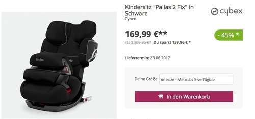 Kindersitz der Gruppe 1/2/3: geeignet ab 9 Monaten bis ca. 12 Jahre (9 - 36 kg). ISOFIX Connect: Konnektoren, die mit den Isofix-Befestigungspunkten des Fahrzeuges verbunden werden. Gurtsystem für das Kind: 3-Punkt-Gurt des Autos. 11-fach höhenverstellbare Kopfstütze und neigungsverstellbare Rückenlehne. Die Versandkosten betragen zusätzlich 4,95 Euro.