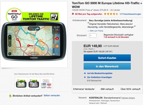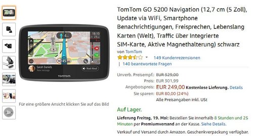 Amazon bietet heute, 18.05.17, das TomTom GO 5200 Navigationsgerät in Schwarz für 249€ an. 12,7 cm (5 Zoll) Update via WiFi Smartphone Benachrichtigungen, Freisprechen Aktive Magnethalterung Lebenslang Karten-Updates (Welt) Lebenslang Radarkameras (auf Wunsch) Lebenslang TomTom Traffic TomTom MyDrive TomTom-Dienste über eine eingebaute SIM-Karte Amazon Kunden haben diesen 5 Zoll Spitzenmodell von TomTom mit 3,5 Sternen bewertet (250 Kundenrezensionen).