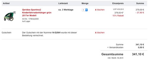 Der Gutschein mit der Nummer N-D2NH im Warenkorb eintragen und 10% sparen, nur heute 18.05.2017. Der Gutschein ist gültig auf alles ab 25 Euro MBW.